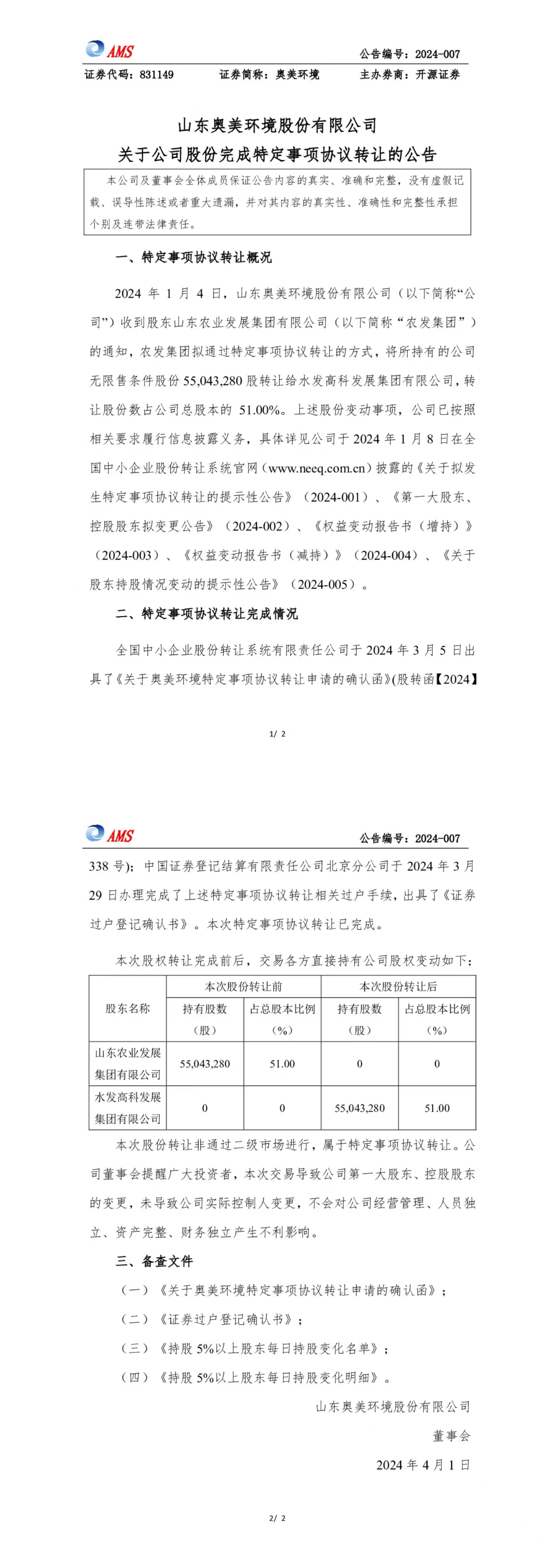 山東奧美環(huán)境股份有限公司 關(guān)于公司股份完成特定事項(xiàng)協(xié)議轉(zhuǎn)讓的公告【2024-007】