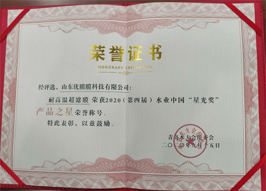 本次大會(huì)設(shè)立了2020(第四屆)水業(yè)中國(guó)“星光獎(jiǎng)”“產(chǎn)品之星”的評(píng)選活動(dòng),參與評(píng)選的產(chǎn)品都是來(lái)自全國(guó)各地的具有雄厚實(shí)力企業(yè)的拳頭產(chǎn)品,經(jīng)歷層層評(píng)選,山東優(yōu)膜膜科技有限公司耐高溫超濾膜憑借優(yōu)越的化學(xué)穩(wěn)定性和超高的耐溫性能一舉獲得了2020年第四屆水業(yè)中國(guó)“星光獎(jiǎng)”“產(chǎn)品之星”的榮譽(yù)稱(chēng)號(hào),在此,特別感謝組委會(huì)對(duì)優(yōu)膜科技耐高溫超濾膜給予的高度肯定。